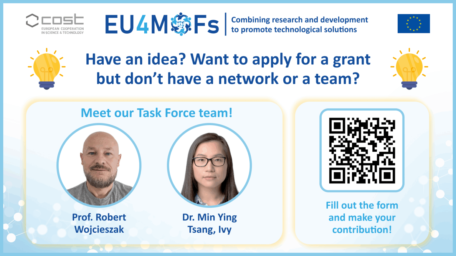 That’s why we’re thrilled to launch our dedicated Task Force for European Grant Applications. Our goal is clear: to motivate and facilitate joint applications within our Eu4MOFs community.