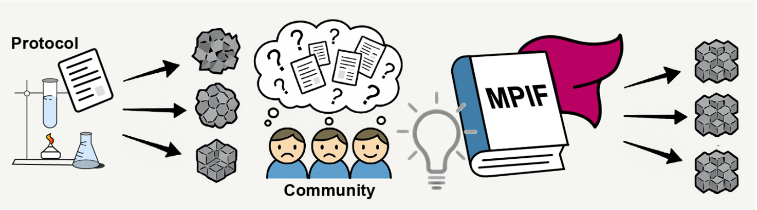 To support reproducible and transparent reporting, WG1 has led the development of the Material Preparation Information File (MPIF) — a structured, machine‑readable format capturing essential synthesis details. This effort is laying the foundation for a community‑wide standard compatible with databases and machine‑learning tools (more details).